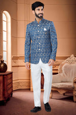 Dusky Blue Jacquard Readymade Jodhpuri Suit