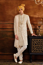 Extravagant Cream Art Silk Fabric Hand Work Shrewani