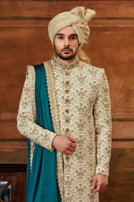 Tempting Cream Art Silk Fabric Hand Work Shrewani