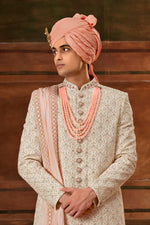 Trendy Textured Cream Georgette Fabric Hand Work Shrewani