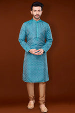 Excellent Jacquard Fabric Cyan Color Kurta Pyjama For Men